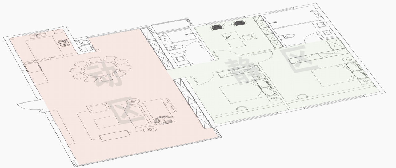 针对不同空间的价值定位,居住空间可分为动区和静区。 日常活动比较频繁的区域,称之为“动区”比如客厅、餐厅等开放空间;反之,称之为“静区”,静区需要放松、安静、无干扰,比如卧室、书房等。 动区与静区对环境优化方案的需求迥异。